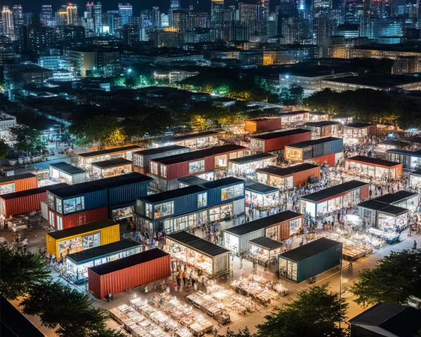 集装箱夜市具有极强的灵活性,可根据场地条件、活动需求快速调整布局。无论是临时搭建在城市广场、公园空地举办短期主题市集,还是长期设置在商业街区、旅游景区形成固定商业体,都能轻松实现。多个集装箱还能自由组合成大型夜市集群,满足不同规模的商业活动需求,成为城市商业发展的“百变金刚”。